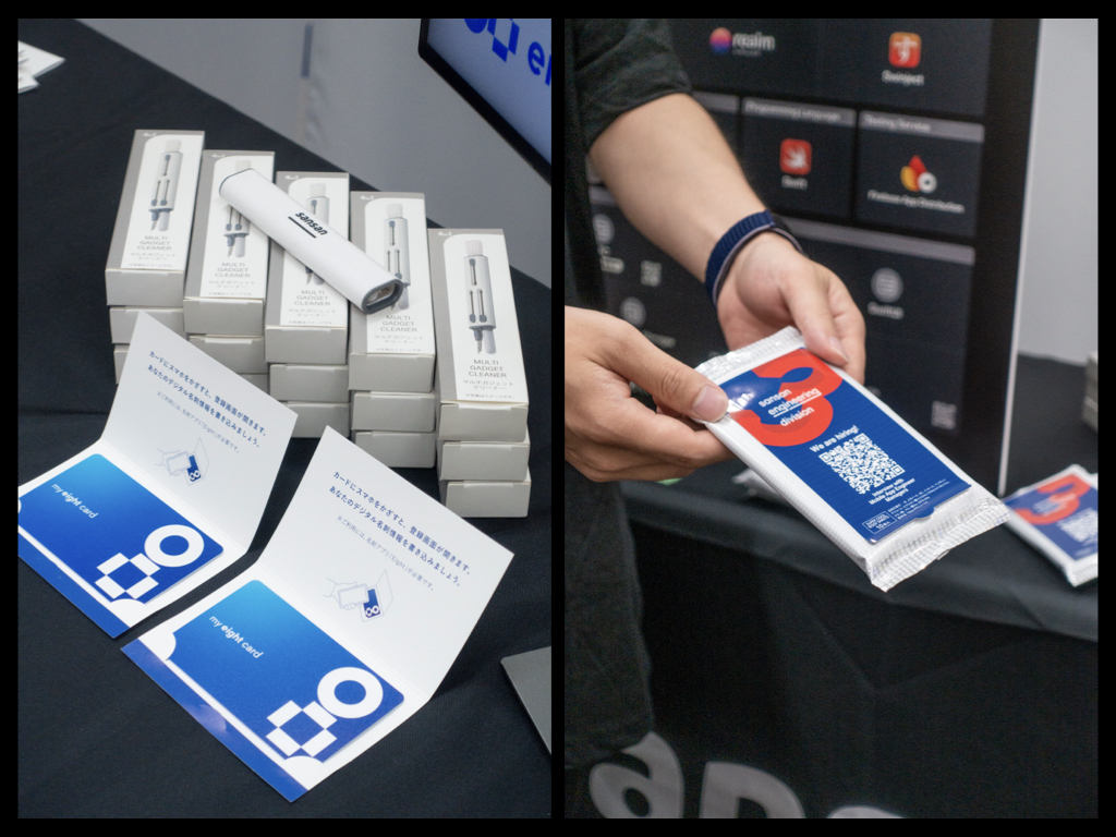 当日は夏真っ盛りの暑い日で冷感ボディーシートはかなりの枚数を受け取っていただけました。 Eightキャンペーンと題し、参加の状況に応じて、アプリを起動せずに名刺交換ができるMy Eight Cardとマルチクリーナーをお渡ししました。 My Eight CardはNFCを利用した技術でかざすだけでデジタル名刺を交換できるカードです。来場者の方々に読み取りを試していただいたところ、そのスムーズさに驚かれる方もいらっしゃいました。