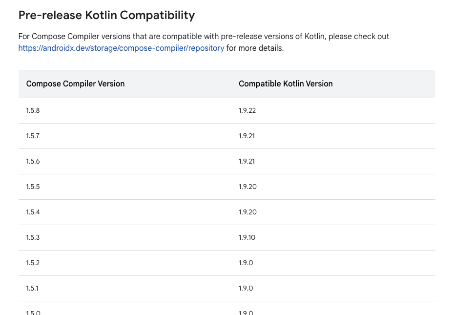 - kotlinとjetpack_compose_compilerはバージョンごとに1対1対応しているため、kotlinをアップデートしたい時はjetpack_compose_compilerも必ず同時にアップデートしないといけません。